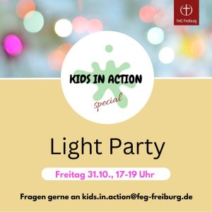 Wir laden alle Kinder von 6-12 Jahren am Freitag den 31.10. von 17-19 Uhr zu unserer Light Party ein. Anstelle von Halloween wollen wir ein fröhliches, buntes Fest feiern. Wir wollen Jesus als Licht der Welt kennenlernen und gemeinsam Lichterspiele spielen. Wir freuen uns sehr auf dieses bunte Fest.